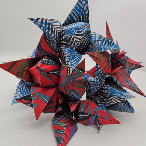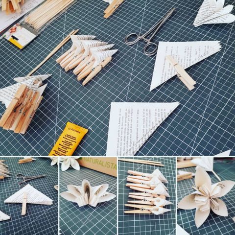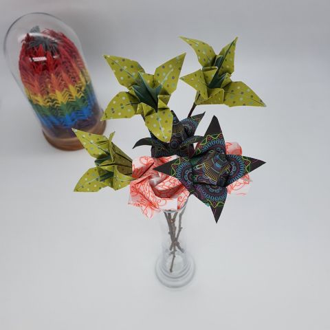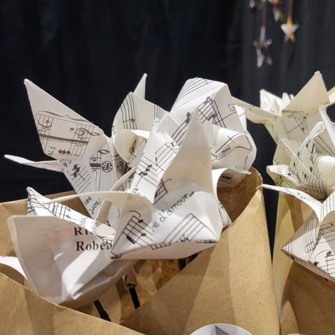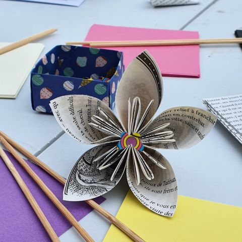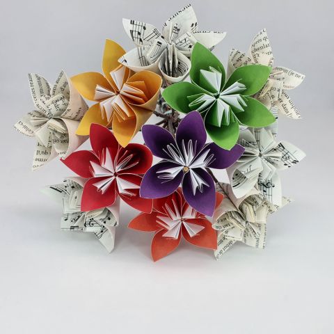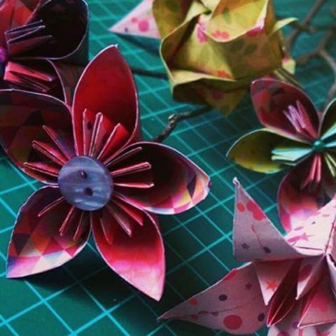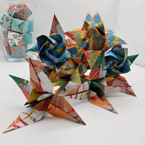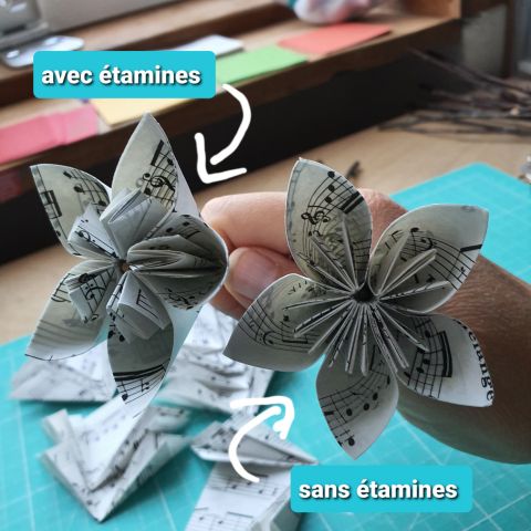 Les pliages sont réalisés avec des papiers surcyclés ( partition de musique, papier roman, bandes dessinées…..) ou bien avec des papiers fantaisies.