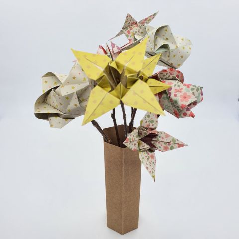 Le papier est plié, puis assemblé avec de la colle extra forte sans solvant. Si les fleurs sont en bouquet, j’ajoute une branche de bouleau qui me sert de tige pour la fleur. Cette touche apporte une note naturelle et réaliste à votre bouquet.